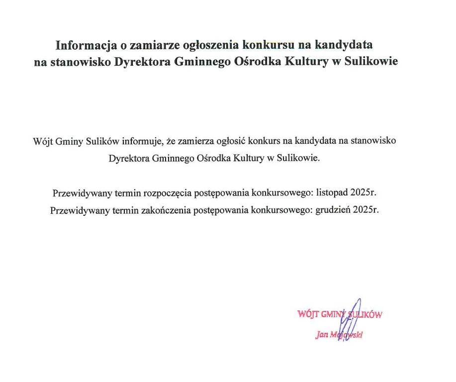 Strona główna BIP Wpisy BIP Oferty pracy Informacja 9 listopada, 2025 Informacja o zamiarze ogłoszenia konkursu na kandydata na stanowisko Dyrektora GOK w Sulikowie. Poprzedni